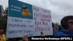 На митинг собралось около трехсот человек. Лозунги протестного мероприятия: "Кашель пенсионеров должен быть услышан!", "Забота о старости начинается с всеобщей забастовки", "Суть пенсионной "реформы" - бесплатный проезд в катафалке", "Мы против путинизма и против кражи наших пенсий", "Работай и копи на гроб". Митингующие скандировали: "Медведева в отставку!", "Путин вор!".