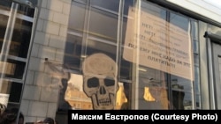 На акцию Евстропов вышел от "Партии мертвых", в руках он держал плакат "Жизнь трудна, но, к счастью, коротка".