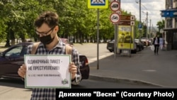 В Барнауле члены движения "Весна" провели в центре города серию одиночных пикетов в поддержку задержанных московской полицией журналистов и блогеров Ильи Азара, Виктора Немытова и Владимира Воронцова. Активисты сообщили корреспонденту Сибирь.Реалии, что главным их лозунгом был "Одиночный пикет - не преступление!".