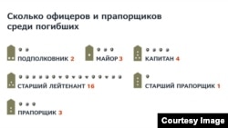 19,5% погибших из нашего списка были офицерами и прапорщиками. Это не значит, что четверть всех погибших военных — офицеры. Эксперт британского Королевского института исследований в области обороны и безопасности Самуэль Кренни-Эванс говорил "Би-би-си", что, во-первых, тела офицеров доставляют домой в первую очередь. Об их гибели, как правило, сообщают публично. Во-вторых, российские офицеры действительно чаще оказываются на поле боя, чем, например, их западные коллеги, поскольку "сержанты в российской армии чаще всего лишь управляют техникой или исполняют приказы, то есть они никем не руководят".